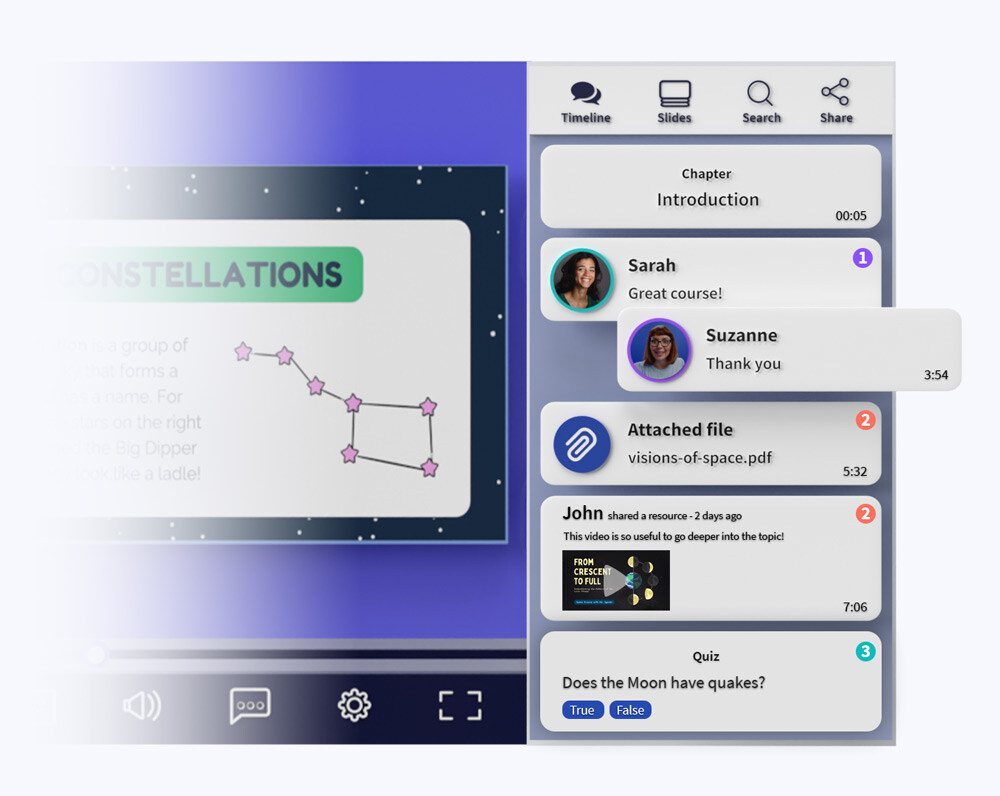 Make your audience interact in a new way and take your videos to the next level with the most advanced social learning features.